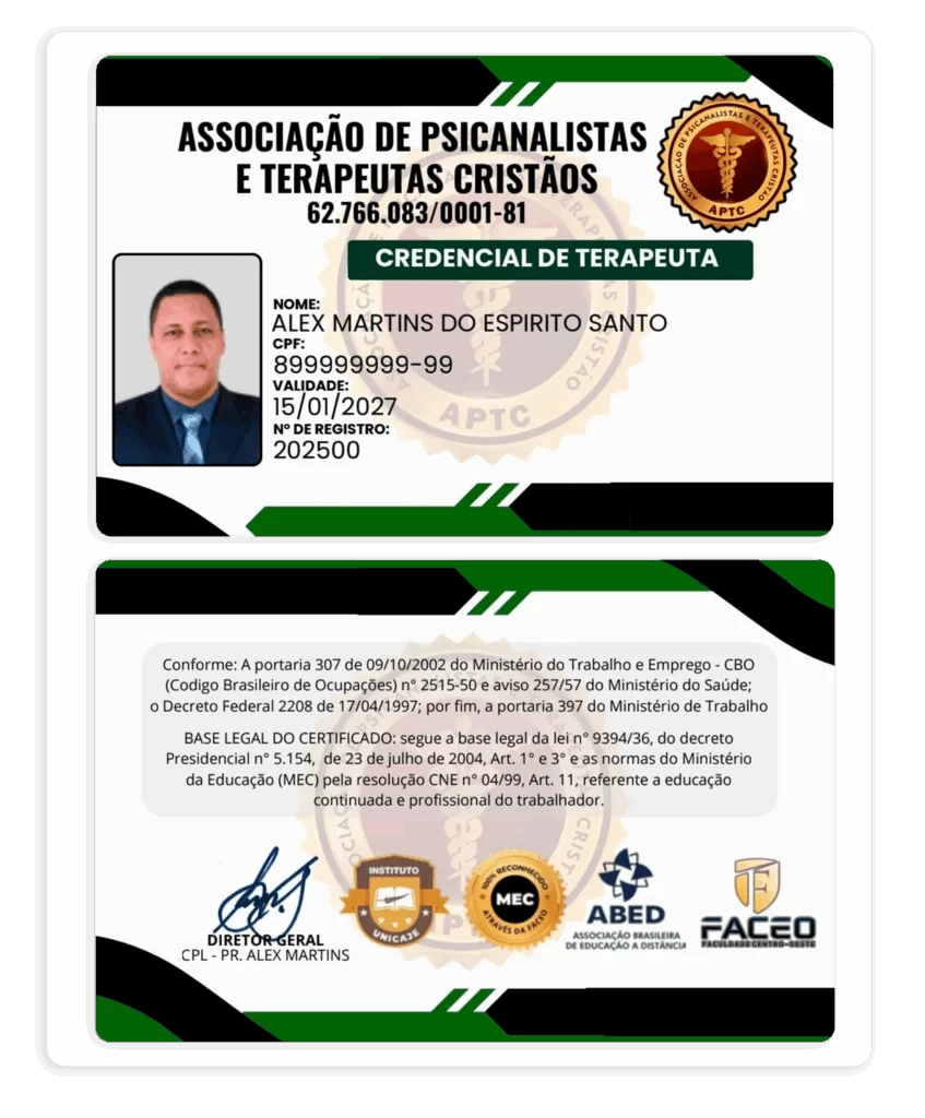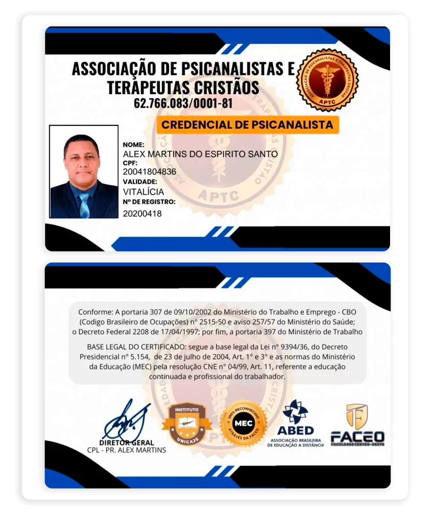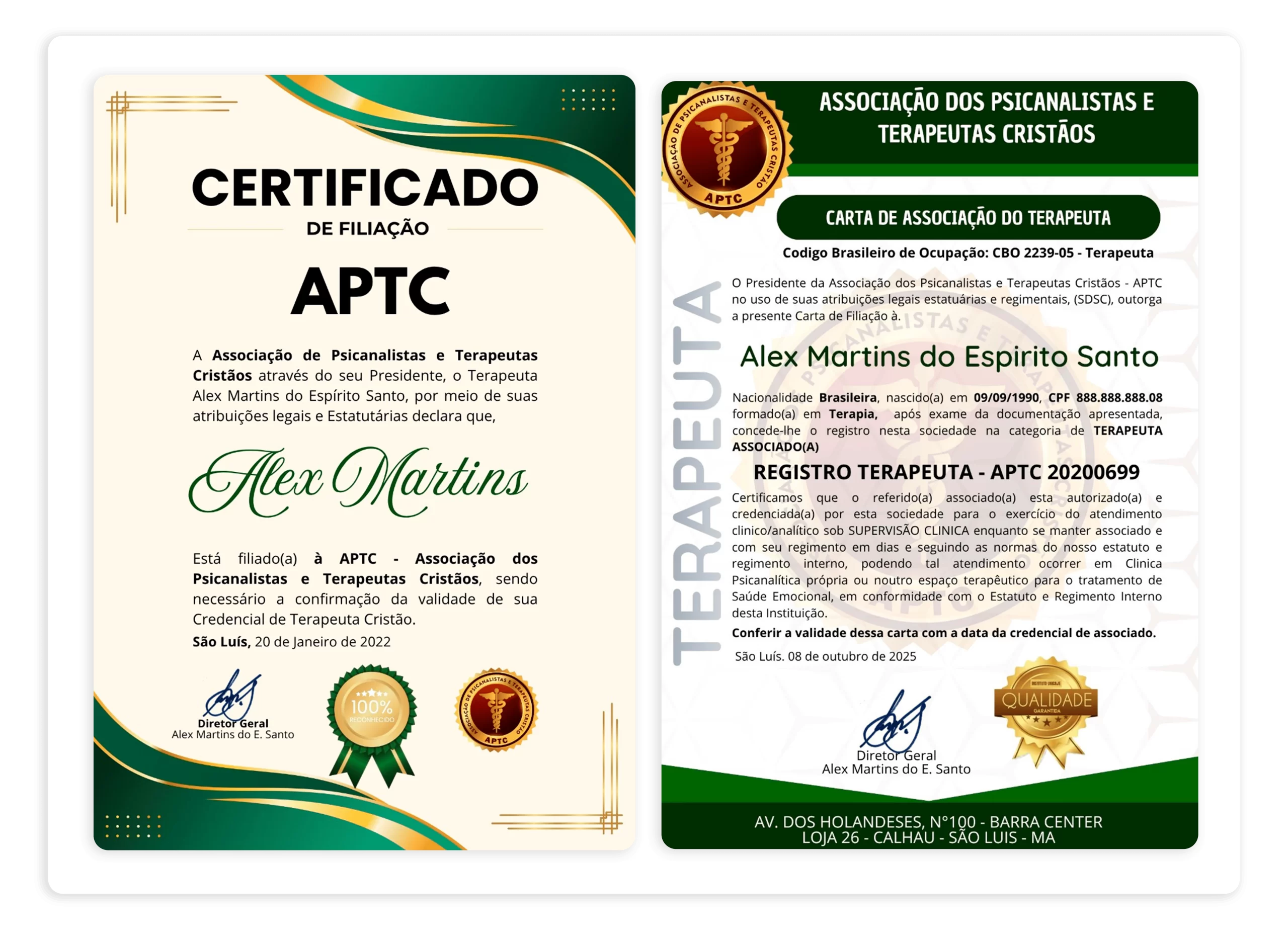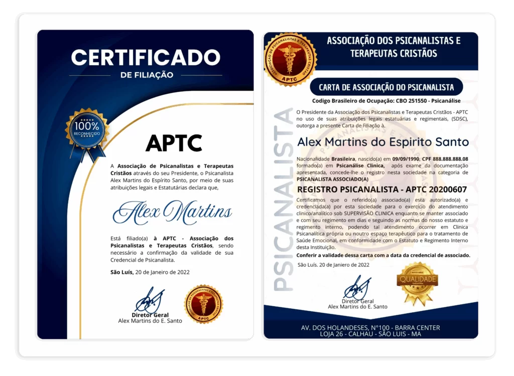 A ASSOCIAÇÃO DE PSICANALISTAS E TERAPEUTAS CRISTÃOS, é uma instituição comprometida com o legado de Freud e Lacan, e tem como objetivo a transmissão da Psicanálise através de dispositivos, bem como assegurar que os Psicanalistas credenciados nesta instituição possam atuar de forma profissional em suas clínicas ou a domicílio amparado pela CBO – 2515-50, que descreve as atividades realizadas por um psicanalista, incluindo aplicação de técnicas psicanalíticas para tratar questões de saúde mental, utilizando métodos baseados na teoria de Sigmund Freud e de outros autores, e ainda gozar de todos os direitos Estatutário da ASSOCIAÇÃO DE PSICANALISTAS E TERAPEUTAS CRISTÃOS
